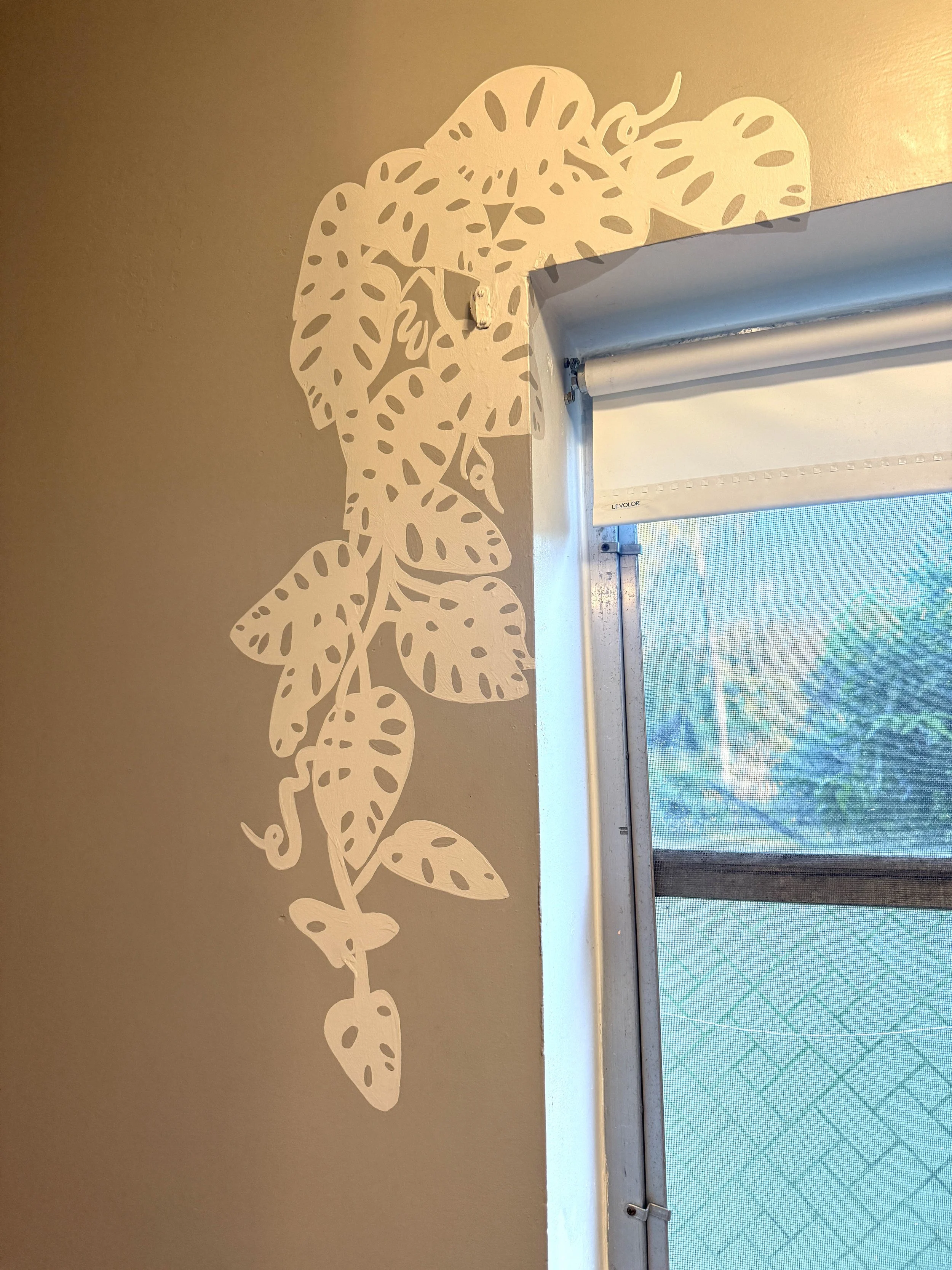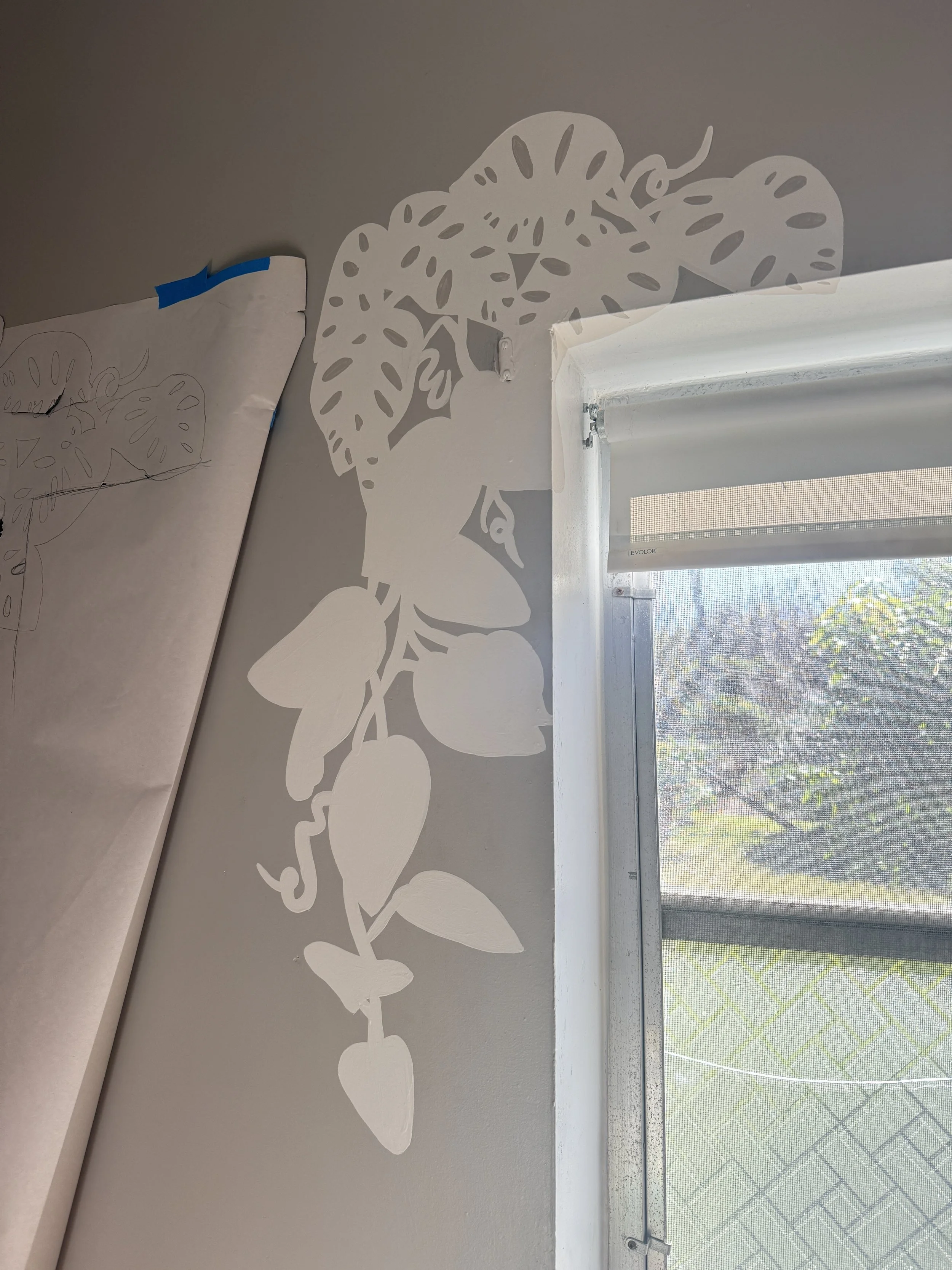 After transferring the first cartoon (ie. outline drawing), I realized it would be much faster to paint the leaf shapes whole, then go back and paint the holes on like dots using the original wall paint color, rather than paint around each hole. I wound up needing to paint 2-3 layers on everything so I’m glad I discovered that method really early on!