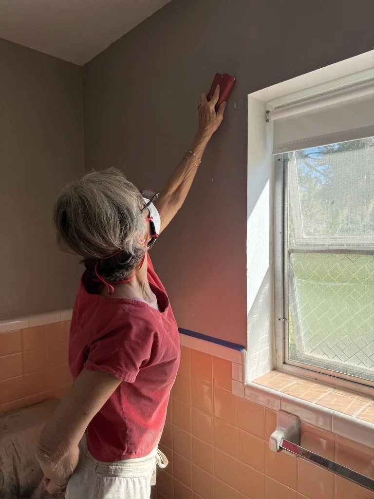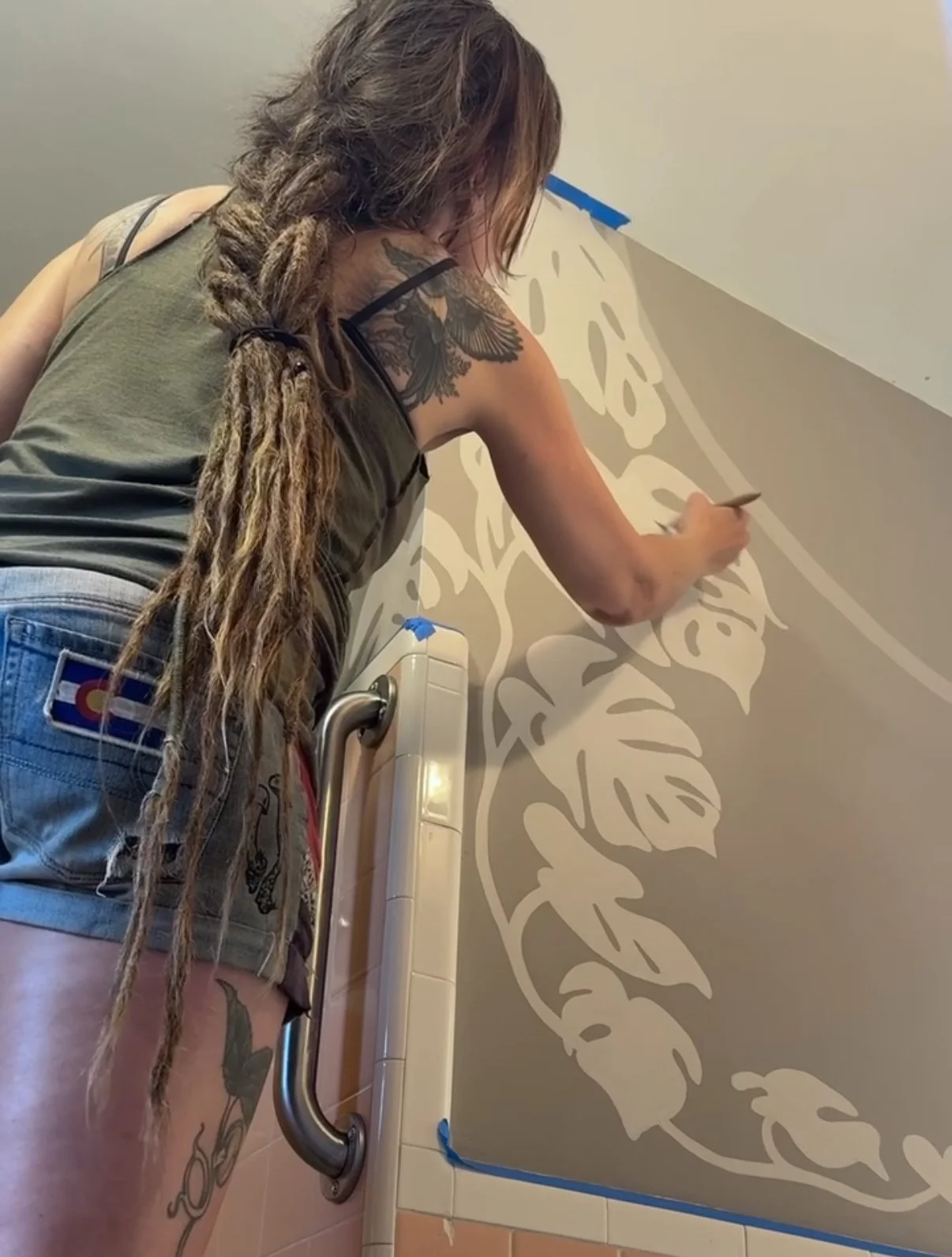 Good thing my mom is also so darn artsy because she had a projector and a huge roll of newsprint for me to enlarge and transfer my drawings to the wall. I have used projectors for murals just straight onto the wall in the past, but there isn’t space in a bathroom to back up far enough, so this technique was perfect. (See my exact transfer technique in the video below)
