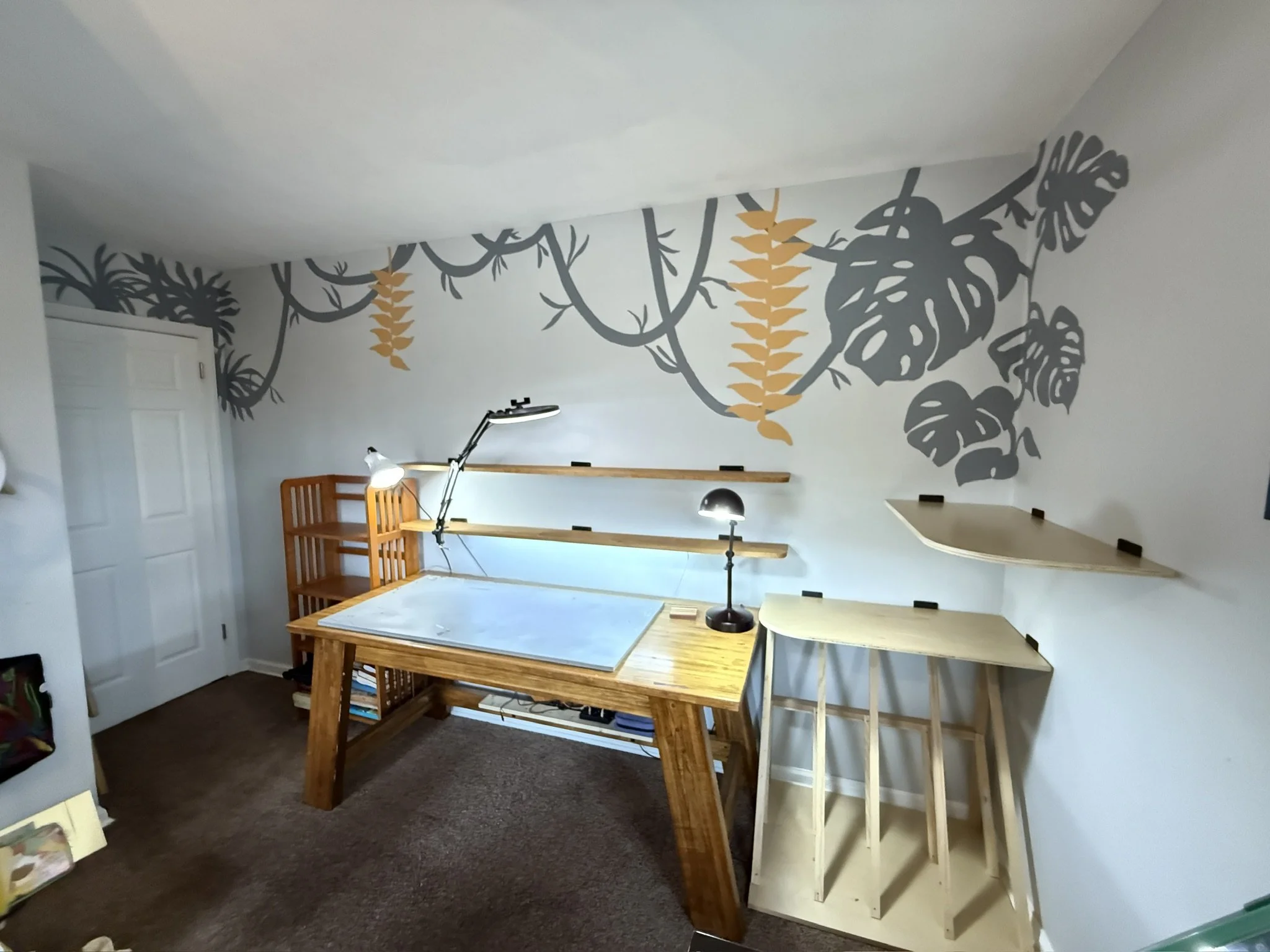 Last but not least, my studio mural done about a year ago, with awesome shelves built by my hubby:)