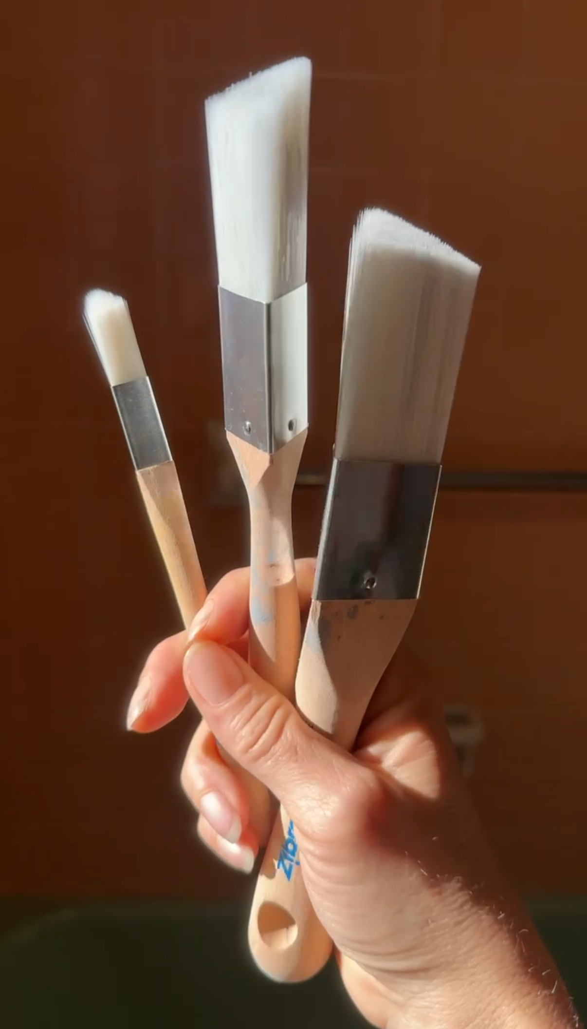 Painting the big monstera leaves was definitely my favorite part (even though I had to do those three times for full opacity!), not only because it was a delightful challenge to make them look dimensional without using any outlines or value shifts, but because the triangle brushes are sooo smooth and dreamy and hold so much paint! This is not an ad, but if you find yourself attempting any kind of accent or mural wall, I highly recommend Zibra triangle shaped brushes. They’re not expensive at all and will save a ton of time.