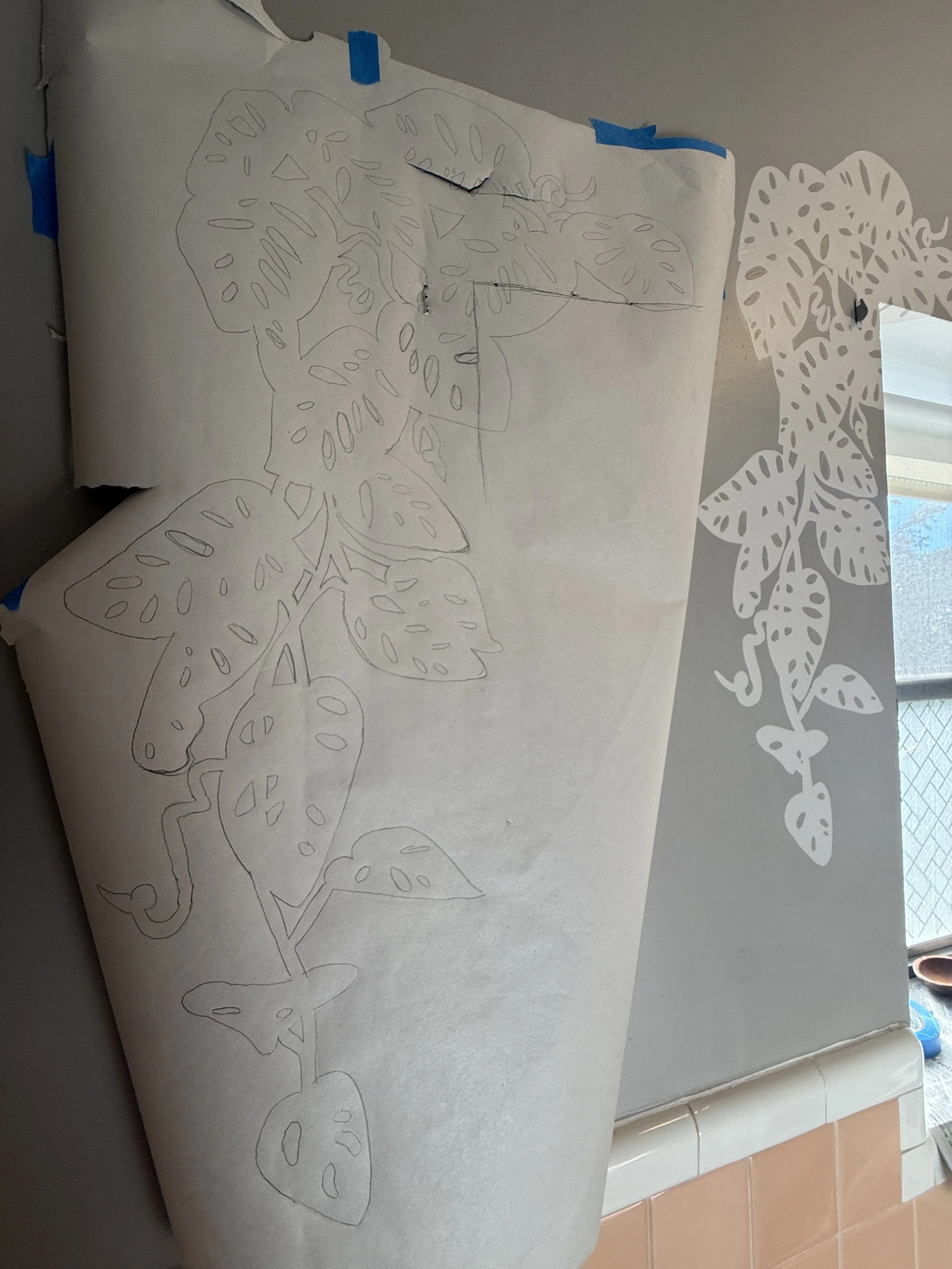 We settled on a series of vines in a midtone and the monstera and adonsonii deliciocasas in a slightly lighter value to create a sense of distance without getting into any more detail than a silhouette.