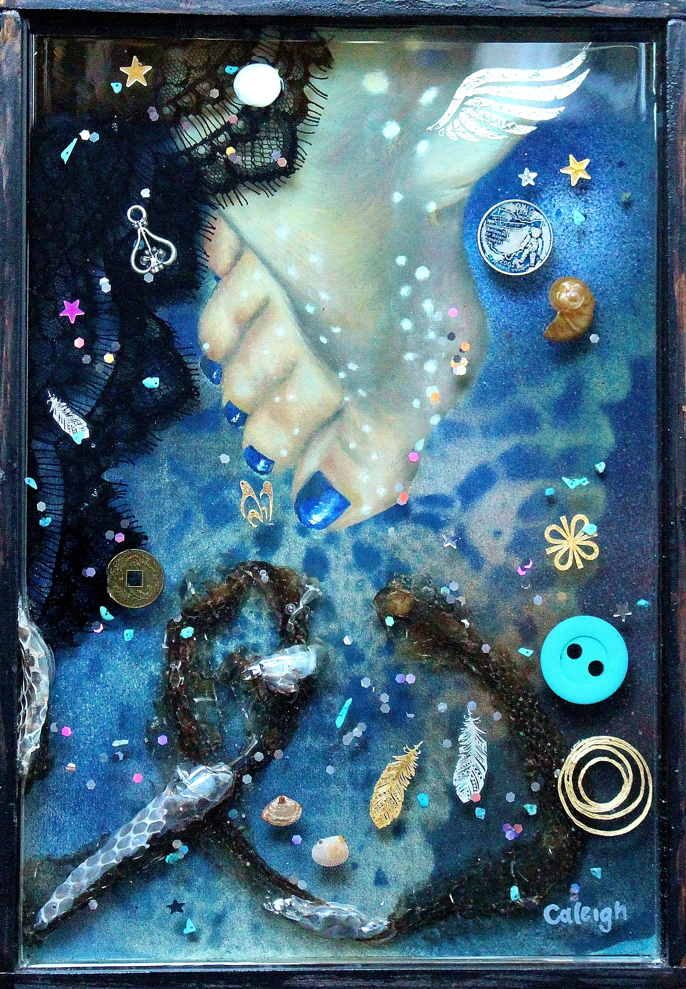This painting was a bit of a first for me as far as just how much mixed media was included along with the fact that this was largely unplanned. Once I had the image of the tiny highlighted foot I just let loose with everything else and am fond of the depth created with so many layers.